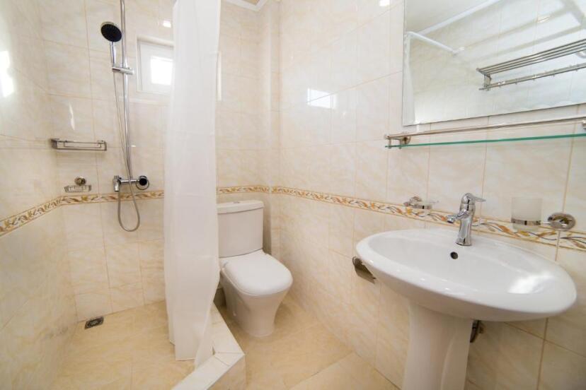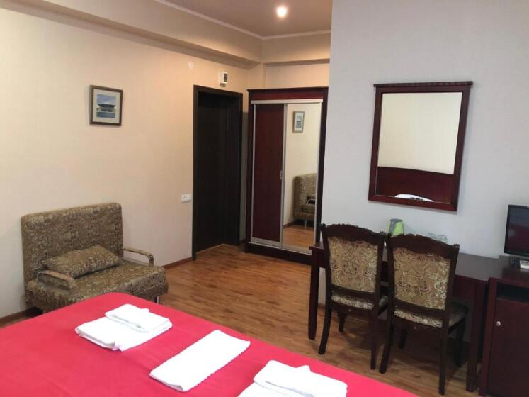 Однокомнатный номер с двумя односпальными кроватями (можно сдвинуть) и ванной комнатой с душем. Оборудован столом, телевизором, холодильником, набором посуды, чайником, кондиционером, Wi-Fi, феном. С балкона открывается вид на горы, город или внутренний двор.