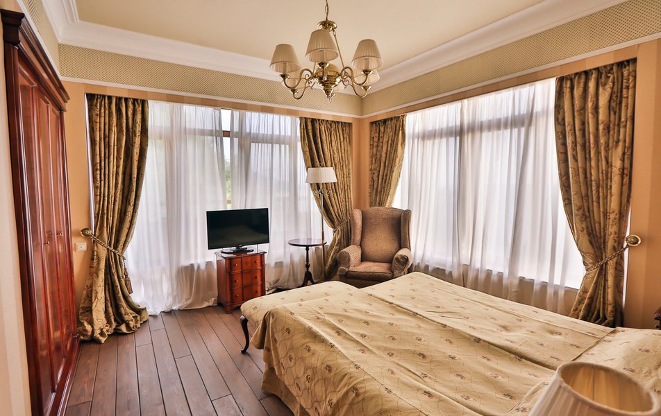 Однокомнатный номер с двуспальной кроватью, комплектом мягкой мебели, журнальным столиком, шкафом, прикроватными тумбочками, кондиционером, сейфом, телевизором, мини-холодильником. Санузел с ванной, феном и туалетно-косметическими принадлежностями. С меблированного балкона открывается вид на море.