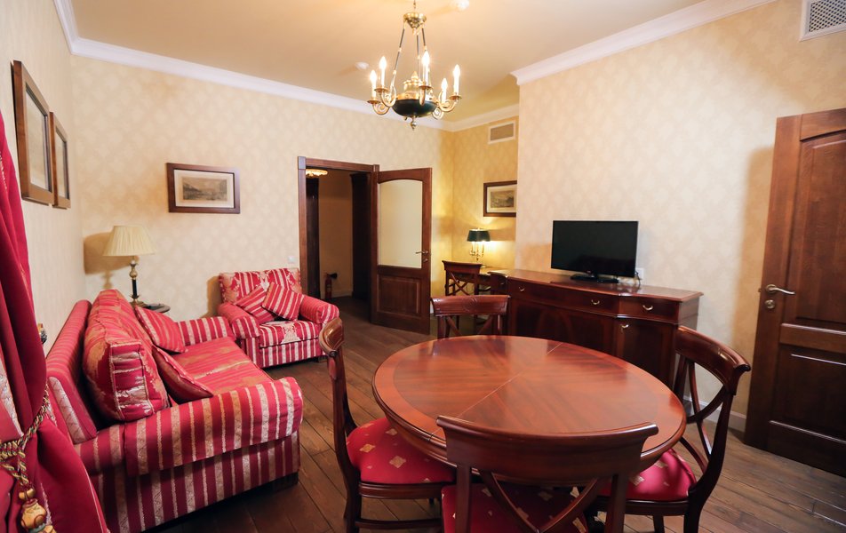 Номер включает спальню с двуспальной кроватью, гостиную с раскладным диваном, меблированный балкон с видом на море. Ванная комната оснащена душевой кабинкой, ванной, биде, феном, туалетно-косметическими принадлежностями. В числе прочих удобств мягкая мебель, шкаф, стол, кондиционер, телевизор, сейф.