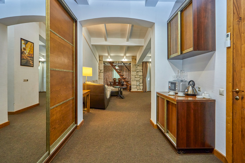 Двухуровневый номер с 2 спальнями, обеденной зоной, зоной отдыха, ванной комнатой с душем и ванной, балконом с видом на море. Для размещения предлагается 2 двуспальные кровати и диван. В числе стандартных удобств Wi-Fi, кондиционер, телевизор, мини-бар, сушилка для белья, сейф, чайно-кофейный набор, фен, халаты, тапочки, гигиенические принадлежности.