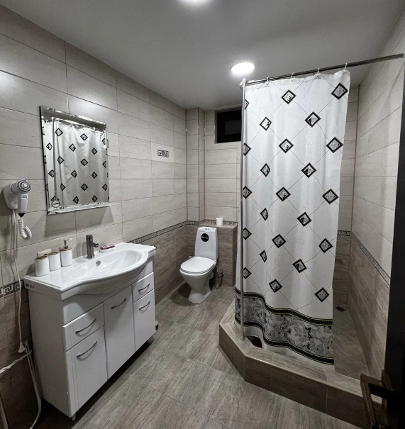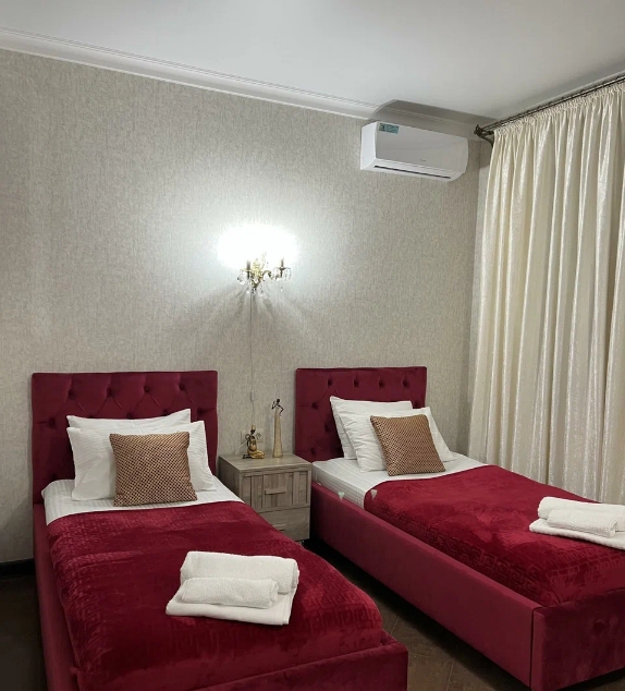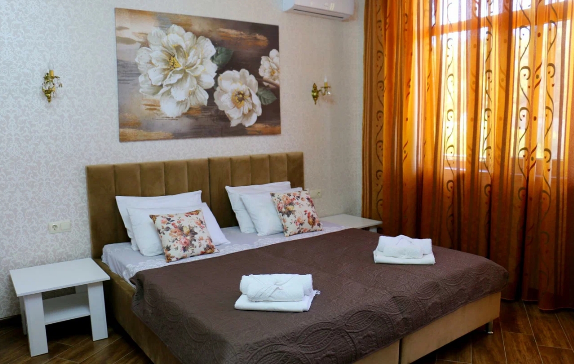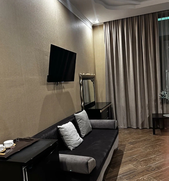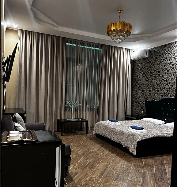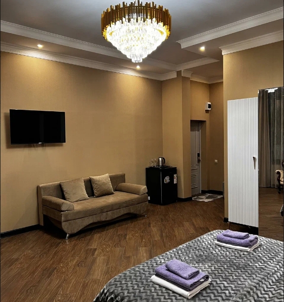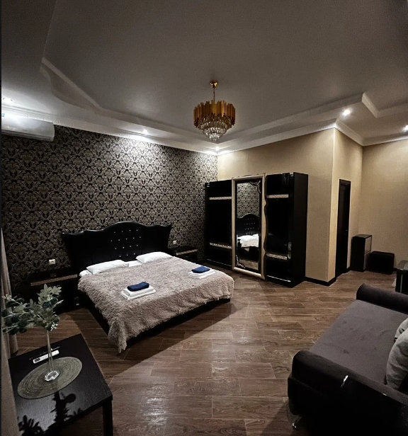 Семейный номер с двуспальной кроватью, диваном и ванной комнатой с душем и феном. В числе стандартных удобств Wi-Fi, кондиционер, телевизор, холодильник, сейф, отопление, принадлежности для приготовления чая и кофе, халаты, тапочки, косметические наборы.
